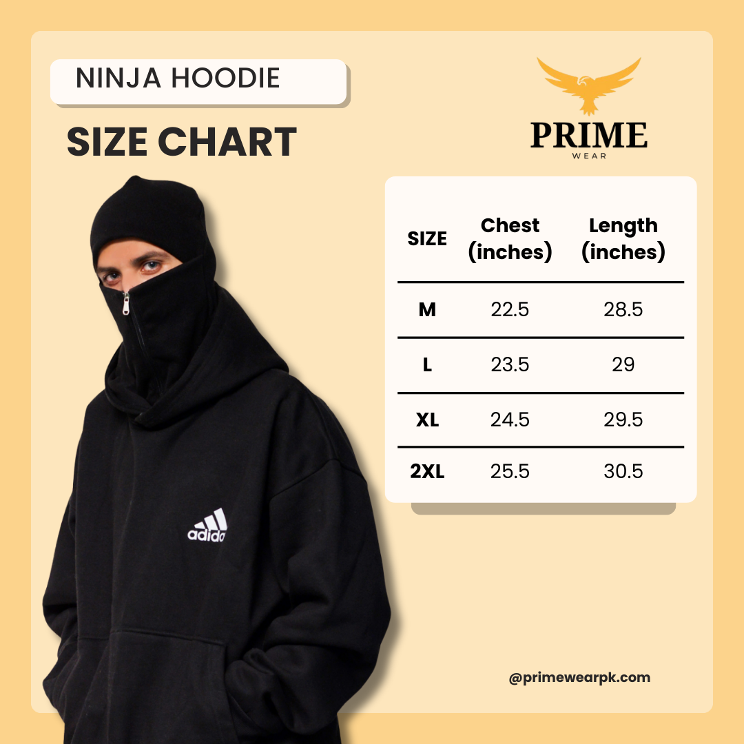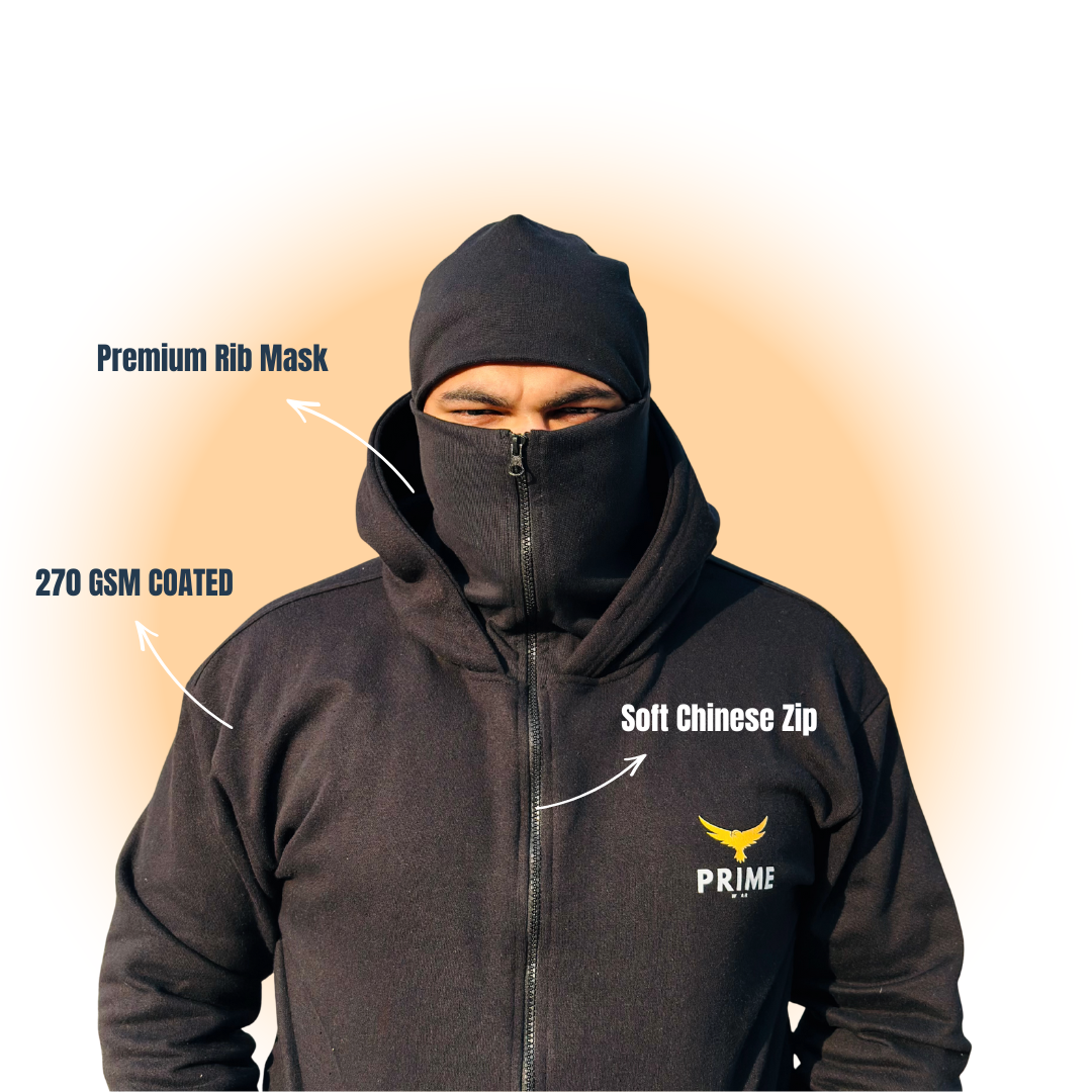 SIntroducing the first-ever Ninja Balaclava Hoodie manufactured in Pakistan by Prime Wear crafted from heavy 270 GSM fleece with premium zipper and rib finishing for warmth, durability and a stealth streetwear look. Perfect for winter, travel and outdoor workouts.